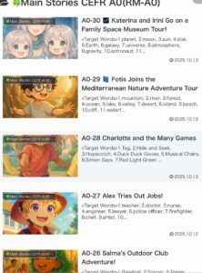 There are stories tailored to CEFR levels A1 to B2. There are 30 to 50 stories at each stage. (Some stories have not been uploaded yet, but please look forward to them.)